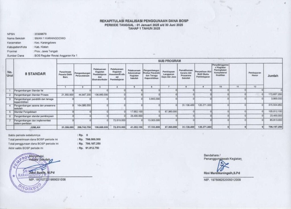 simple-ajax-chat domain was triggered too early. This is usually an indicator for some code in the plugin or theme running too early. Translations should be loaded at the init action or later. Please see Debugging in WordPress for more information. (This message was added in version 6.7.0.) in /home/smankar5/public_html/wp-includes/functions.php on line 6131Berikut Rekapitulasi Realisasi Penggunaan Dana BOSP Tahap 1 2025 SMAN 1 Karangdowo.