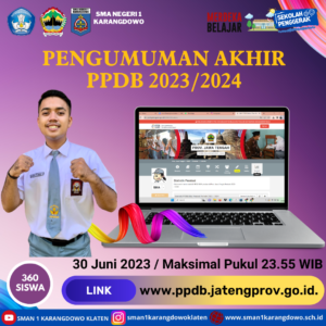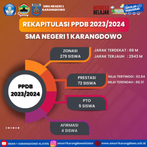 simple-ajax-chat domain was triggered too early. This is usually an indicator for some code in the plugin or theme running too early. Translations should be loaded at the init action or later. Please see Debugging in WordPress for more information. (This message was added in version 6.7.0.) in /home/smankar5/public_html/wp-includes/functions.php on line 6131Pelaksanaan daftar ulang CPD SMA negeri 1 Karangdowo akan dilaksanakan mulai hari Senin-Kamis 3-6 Juli 2023. Dari hasil pengumuman dari Dinas Pendidikan Provinsi Jawa Tengah SMA Negeri 1 Karangdowo mendapatkan hasil 360 peserta didik lolos seleksi PPDB 2023/2024. Dari 360 siswa tersebut dapat dikelompokkan menjadi 4 kategori jalur seleksi PPDB tahun ini. Jalur Zonasi Sebanyak 279 siswa, Prestasi 72 Siswa, Perpindahan Orang tua 5 siswa dan Afirmasi 4 Siswa. Oleh karena itu untuk memperlancar proses daftar ulang CPD harus mempersiapkan dan memahami Alur pelaksaannya.