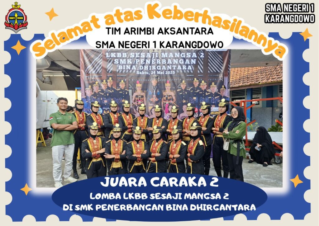 Alhamdulillah, tim Arimbi (Aksantara) SMA NEGERI 1 Karangdowo Mendapatkan Juara 2 Caraka pada Lomba LKBB Sesaji Mangsa 2 di SMK Penerbangan Bina Dhirgantara. Selamat atas prestasinya ananda semuanya.